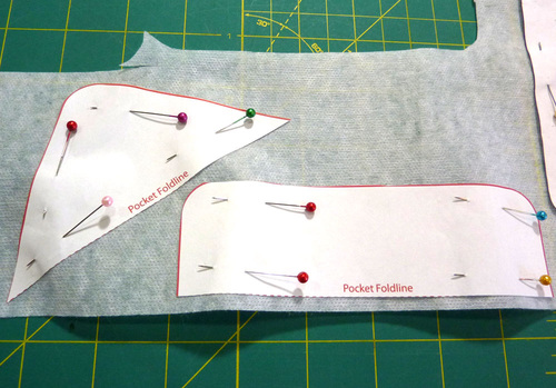 - Using all three trimmed pattern pieces (the main base panel and the two pockets), cut ONE of each from the scrap of lightweight interfacing.