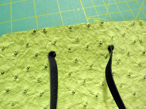 - Scrap or ¼ yard of 44”+ wide faux leather; we originally used a faux ostrich in white and lime green from our stash