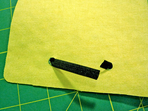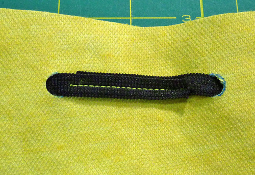 - Edgestitch around the entire perimeter, staying ⅛” or less from the edges. Make sure the elastic loop stays out of the way of the edgestitching.