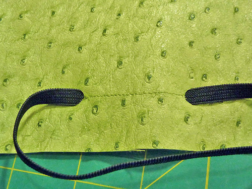 NOTE: The machine should be threaded with thread to best match the faux leather in both the top and the bobbin. The bobbin stitching will be what shows on the right side. We are stitching from the wrong side in order to keep the elastic straight and flat between the two holes. Remember to make sure the front elastic loop is completely out of the way of your stitching.