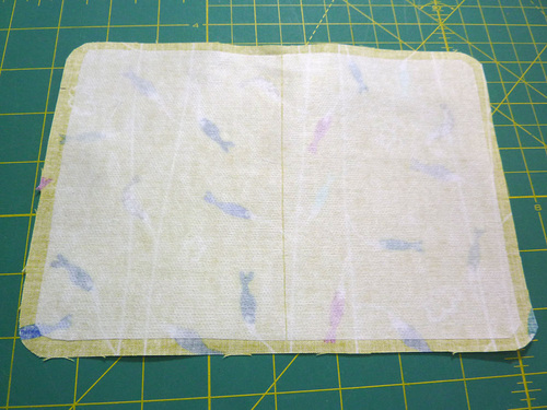 - Find all the quilting cotton pieces and the interfacing pieces. Center the interfacing on the wrong side of one quilting cotton base panel so there is ¼” of fabric showing beyond the interfacing on all sides. There should be a small space down the center of the two interfacing pieces to allow the case to fold easily in half. Following manufacturer’s instructions, fuse in place.