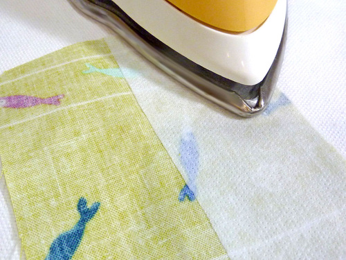 - Center the interfacing along one half of each of the pocket pieces, on the fabric’s wrong side. The outer edges of both layers should be flush. Following manufacturer’s instructions, fuse in place.
