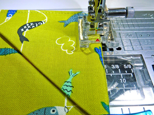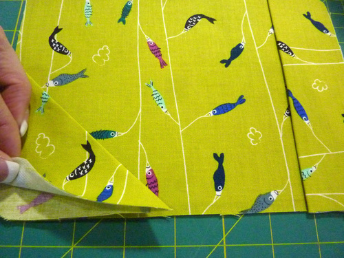 - Place the diagonal pocket in the bottom left corner, aligning the raw edges of the folded pocket with the raw edge of the base panel.