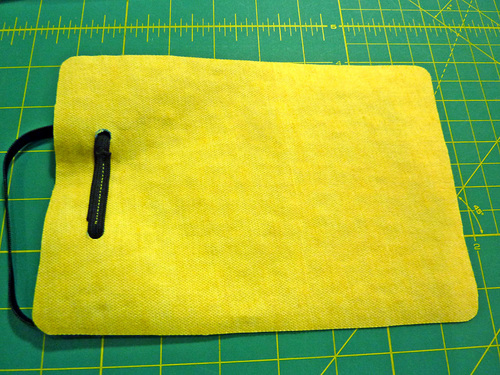 - Find the faux leather exterior panel, which should have the elastic loop sewn down. Place this panel wrong side up and flat on your work surface.
