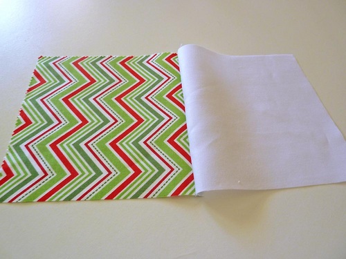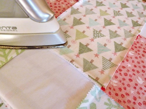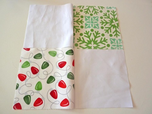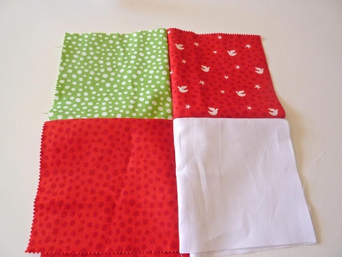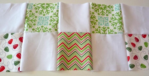 TWO 5″ x 5″ squares of #10 – Bleached White - Take the first pair (Bleached White and Snow Jolly) and pin them right sides together along one 5″ side. Stitch together. Press the finished seam towards the darker square.