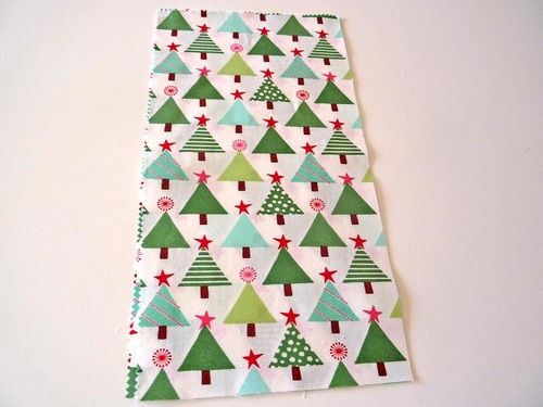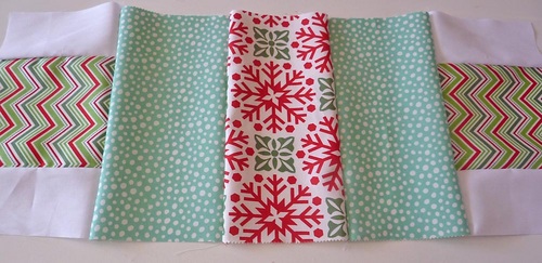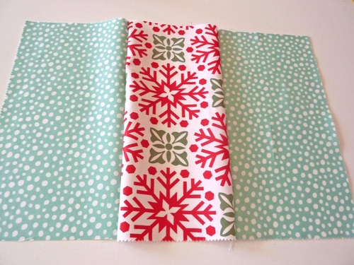 TWO 9½” x 5″ rectangles of Print # 7 – Mint Falling Snow - Pin one Mint rectangle to either side of the Berry rectangle.