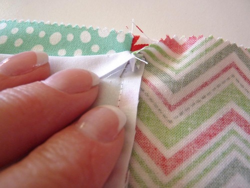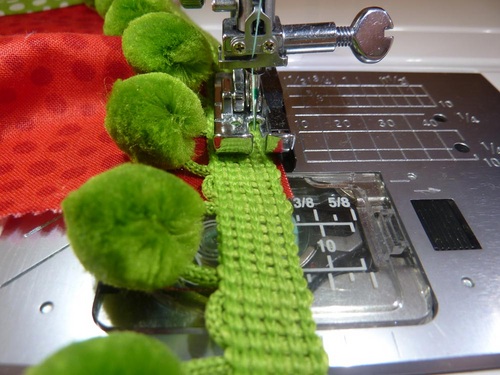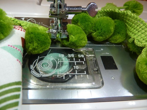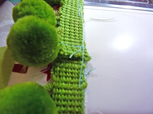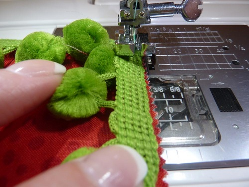 - We you come to a corner, stop with your needle in the down position and curve the trim around the corner, keeping the poms out of the way of the needle.