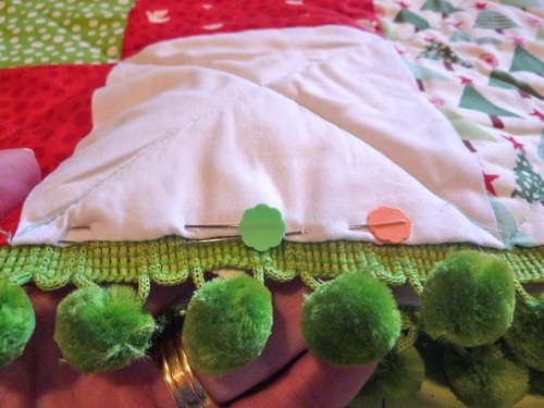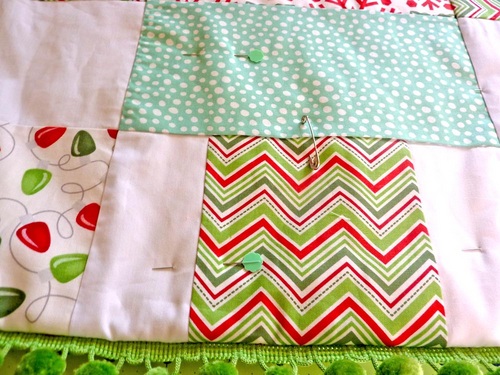 - Place the runner top, with the pom pom fringe basted in place, on the batting. The runner top should be right side up.