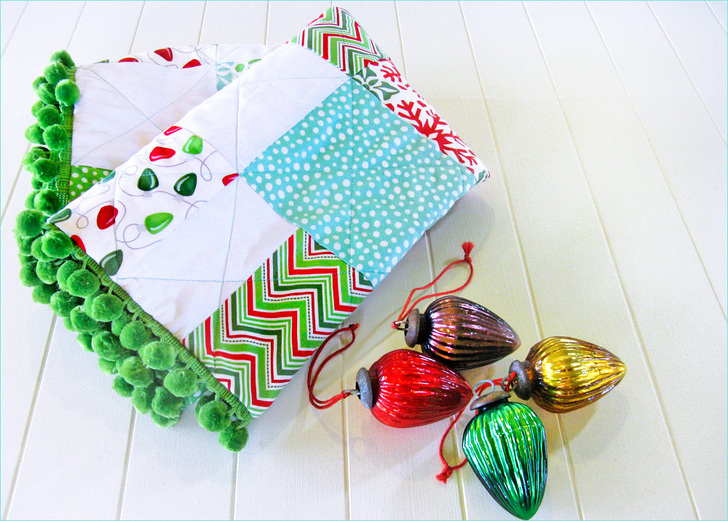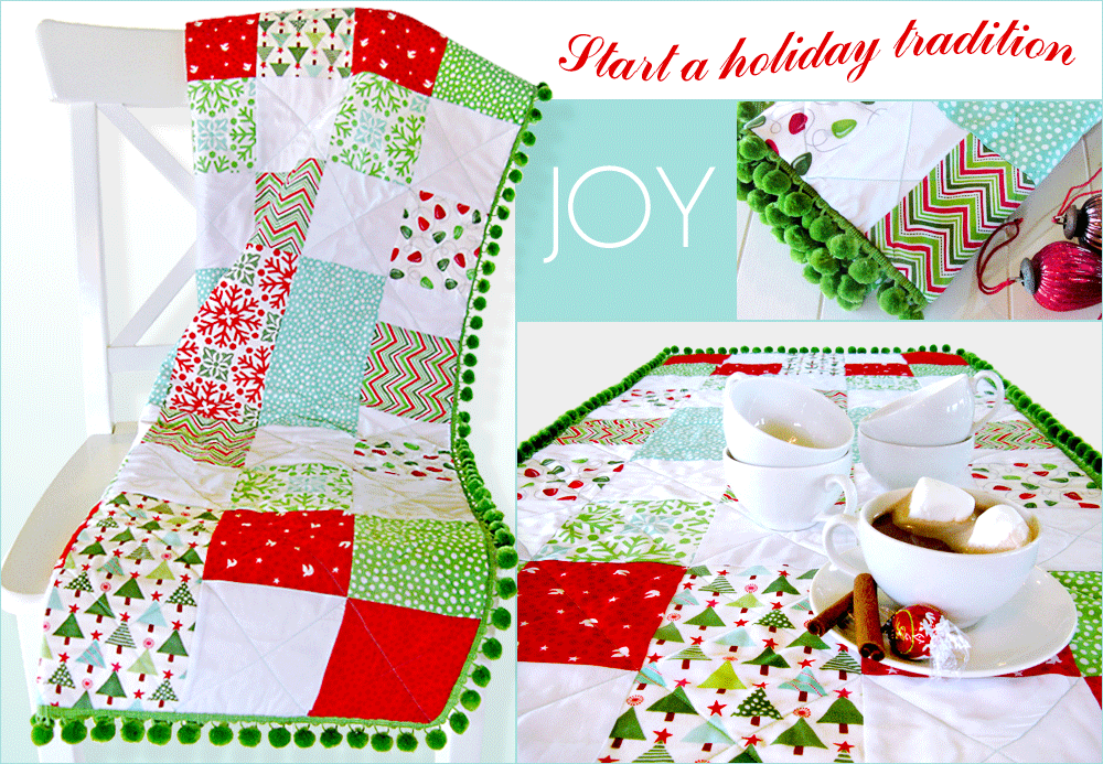 When the boxes come down from the attic every year, one of my favorite Christmas items to uncover is a table runner my mother made for me. It’s the first thing I pull out, and for me, its appearance signals the official arrival of the holiday season. This happy patchwork and pom pom centerpiece certainly has the potential to become a best-loved holiday tradition. Make one for yourself plus a couple more for friends and family. We used a Layer Cake pre-cut bundle, which usually contains forty 10″ x 10″ squares. That’s plenty for several runners, simply add your favorite solid for the accent squares and backing.