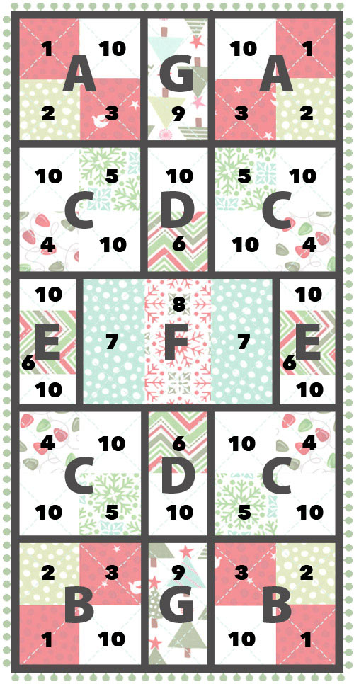 As mentioned above, our runner is created from NINE prints and ONE solid. To help you map out your own patchwork, we’ve added numbers that relate to the original print names used in our block instructions. Kind of like “painting by numbers,” but no brushes and no picture of Elvis on velvet.