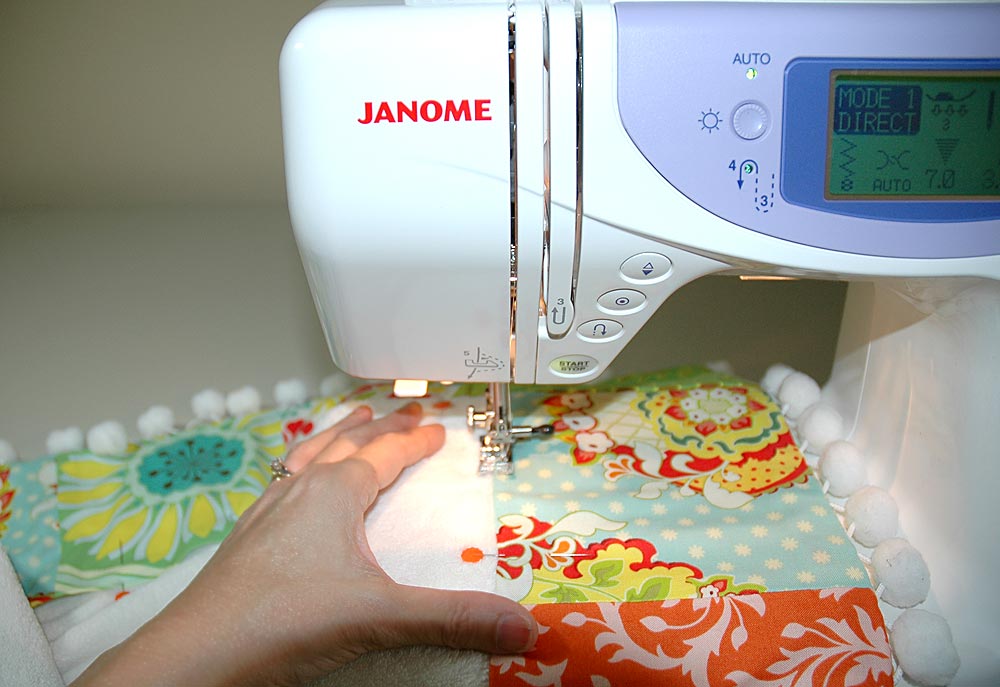 - Stitch around all four outside edges, using a ½” seam allowance. Go slowly and make sure your pom poms stay out of the way of the needle. Remember to remove pins as you go. At each corner, pivot: stop with your needle in the down position ½” from the edge, lift your presser foot, pivot your fabric 90˚, line up for a ½” seam, lower your presser foot and start stitching again.