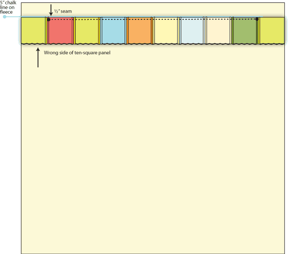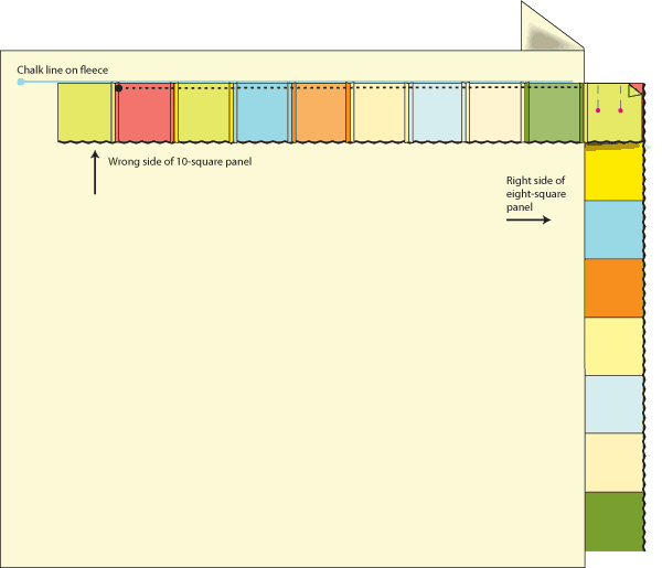 - Locate one lower panel of patchwork (another ten-square row) and repeat Step 2 and Step 3 along the opposite edge of your plush square.