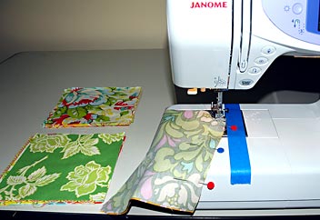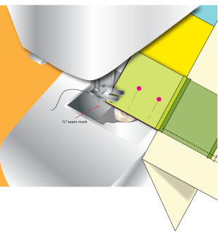 - Stitch from the outer edge toward the existing seam line, remembering to back tack at the beginning and the end of your seam. Make sure you go a couple stitches over your existing seam so there isn’t any hole at the corner. Most machines have seam markings to both the right and the left of the needle. So, use the left markings to line up and make a ½” seam.