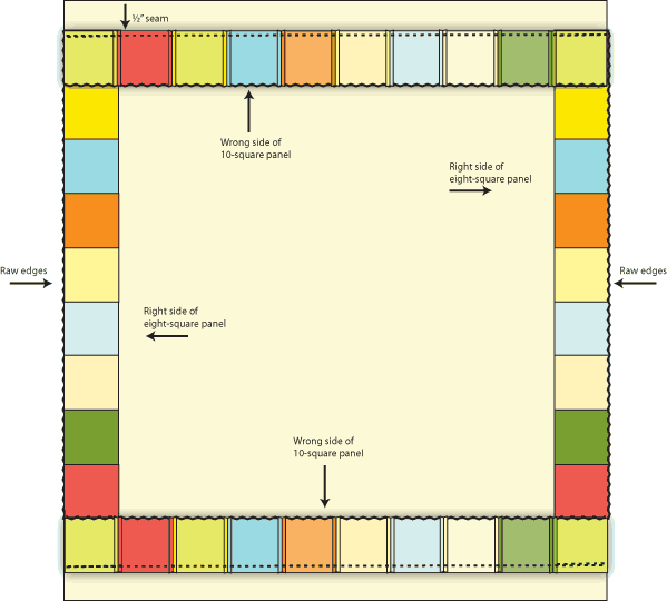 - Find the remaining two ten-square patchwork panels and the remaining two eight-square patchwork panels.