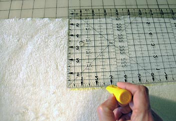 - Lay your plush fabric flat on your work surface. Measure and mark (with your fabric pencil or chalk) 5″ down from all outer raw edges to make a 41″ x 41″ inner square.
