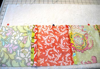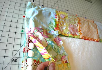 NOTE: As a synthetic, plush does not like the direct heat of an iron. Press on the cotton or use a pressing cloth. - Locate one side panel of patchwork (one of your eight-square rows), and place it right side down on the plush fabric so the top raw edge of the panel is perfectly aligned with the side 5″ chalk line. Pin in place.