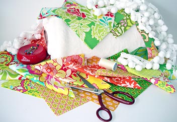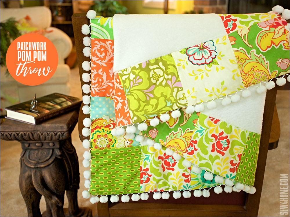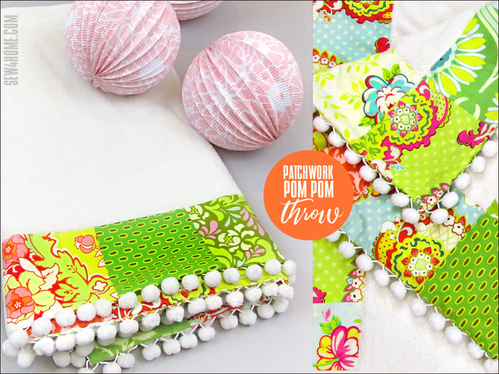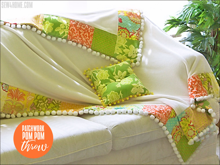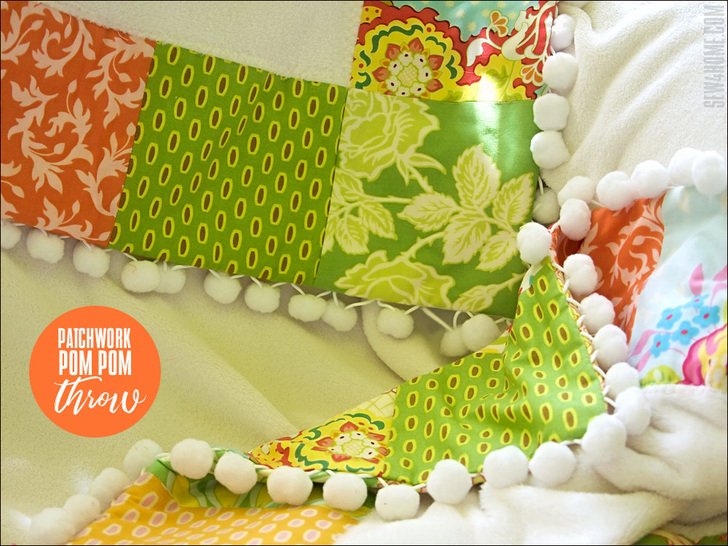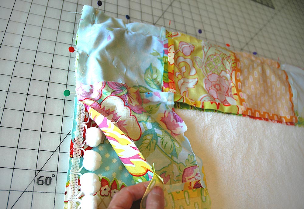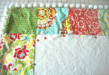 The pom pom trim is optional, but is a whimsical bit of embellishment – especially if your patchwork has a fun motif similar to ours. Want a more “elegant” look, skip the poms altogether or consider a short, dense fringe instead.