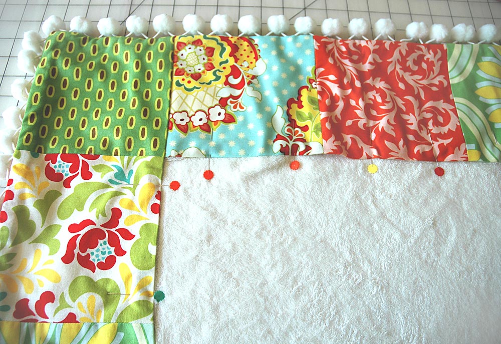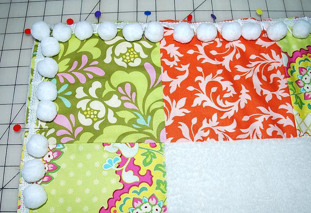 - Place the patchwork frame you just made on top, right side down, sandwiching the pom pom trim between the layers. All raw edges should be flush. Pin in place through all the layers.