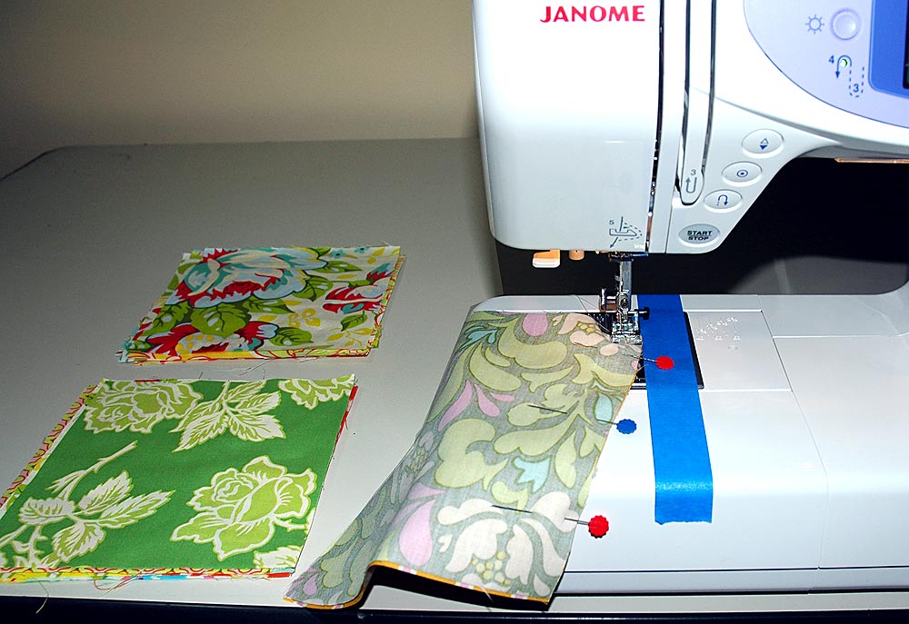 - Stitch the panel in place, using a ½” seam allowance (½” from the raw edge of the patchwork panel). LEAVE THE FIRST AND LAST PATCHWORK SQUARES UNSTITCHED. These squares will be sewn later to the side panels to form the corners.