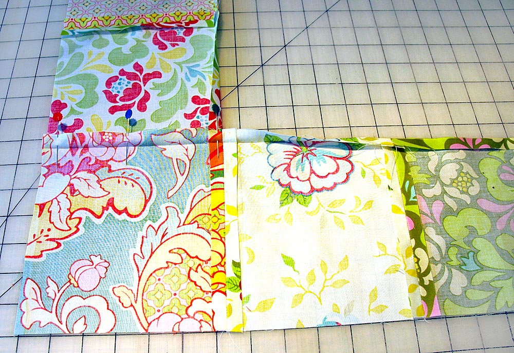 Our original patchwork was made with fabrics from Heather Bailey’s Pop Garden & Bijoux, an older collection that is no longer readily available. You could work from within one collection as we did or use up scraps from a variety of sources. The squares are simple 6″ x 6″ cuts so it’s a great chance to use some of your favorite small pieces. If you are brand new to blending, take a look at our tutorial: Top Ten Designer Tips for Blending Colors and Prints.