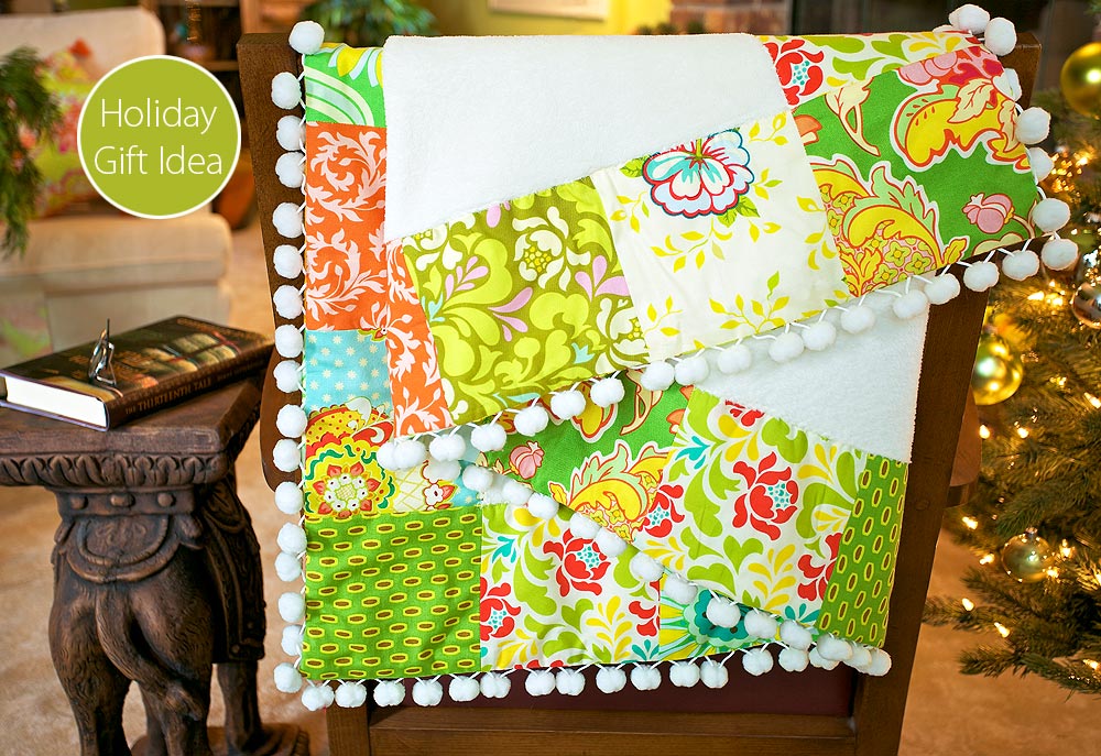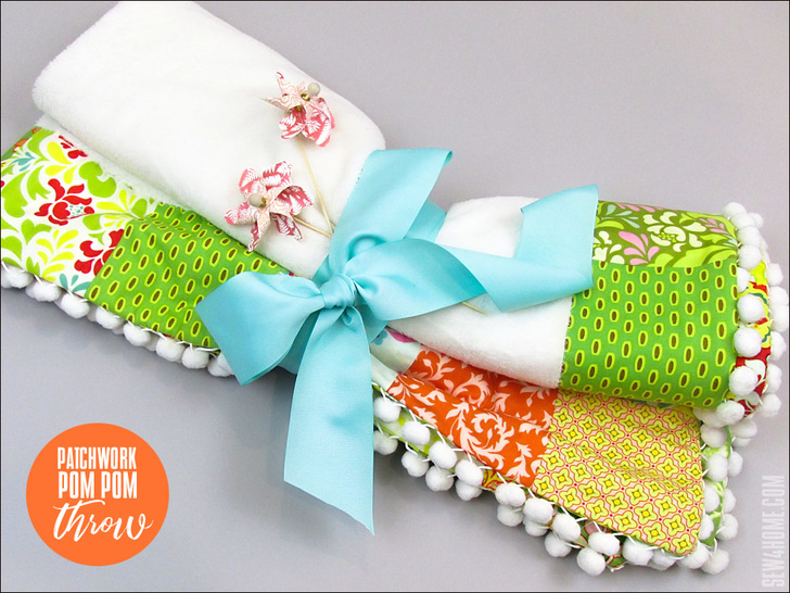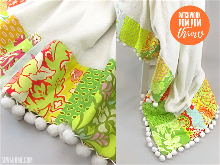 Our plush throw is framed with patchwork and poms. Even if you’ve never done any patchwork, you can make this beautiful blanket. The fun part is picking all the squares: 72 of them in this case. It’s like coloring with fabric; you mix and match, combining colors and patterns from square to square. We selected bright, bold options to create a super vibrant border, but you could vary your own choices to create a more subdued outcome… or even more colorful! The jumbo pom pom trim adds a playful touch, and the center of the throw is super-soft, double-sided luxury plush fleece. Colorful, cute, and cuddly in one great project!