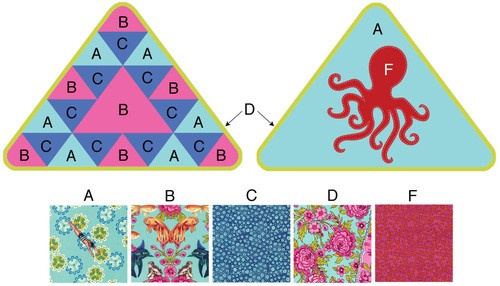 - Download and print out our FOUR Triangle Pattern sheets (one sheet for the center large triangle, one sheet for the three different small triangles, and two sheets for the octopus appliqué), which have been bundled into one PDF to make the download easier.