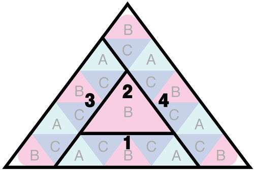 - In the same manner, assemble the seven triangles that make up the left side (step 3 in the drawing above). This includes the left rounded base corner and six small triangles.