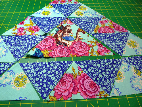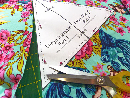 - Using the triangle patterns, plan a fussy cut for each triangle so it has a nicely centered design. This is especially important for the large center triangle.
