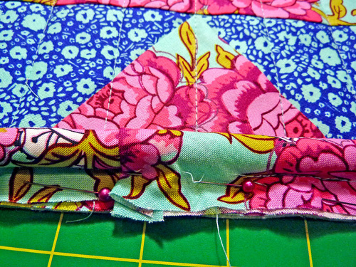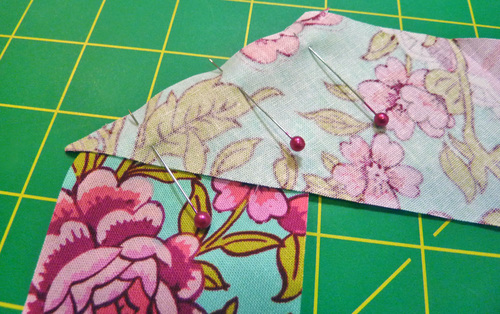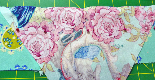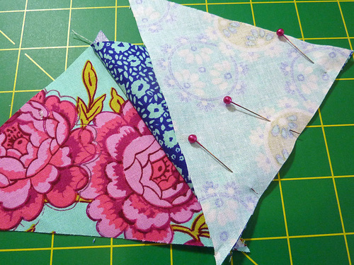 - Place the first two triangles together along their inner raw edges. Pin together. As is normal when working with triangles, the top points will extend approximately ¼”. This is correct.