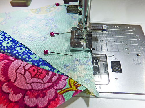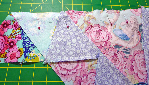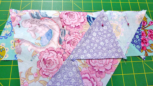 - Assemble the next two triangles in the row in the same manner, then pin the fifth triangle to this second sewn pair.