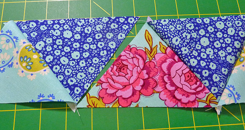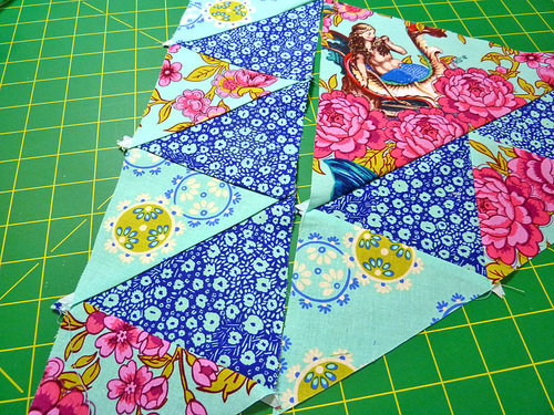 - Stitch together, using a ¼” seam allowance and press gently. You are working with pieces cut on the bias that can easily stretch and distort.
