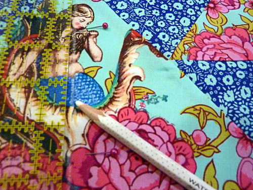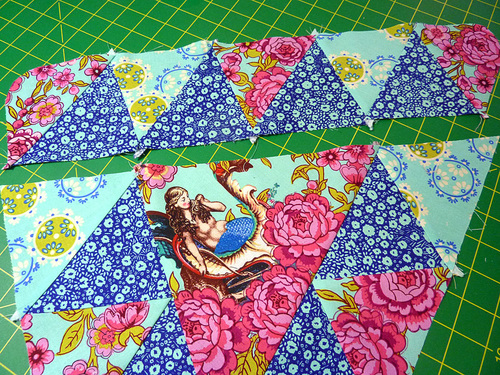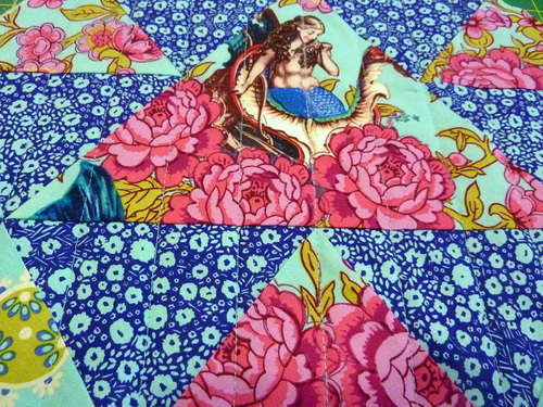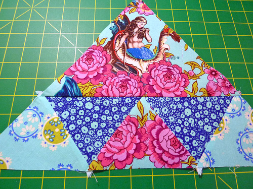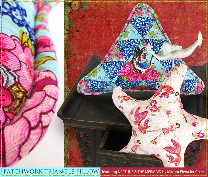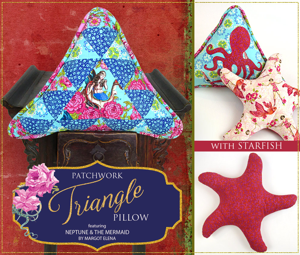 We’ve had so much fun working with the Neptune and the Mermaid fabric collection, especially fussy cutting our favorite motifs to create a unique, personalized look. For the triangle pillow, we chose one of the gorgeous mermaid designs as the center focal point, sounded by a mixture of complimentary prints.
