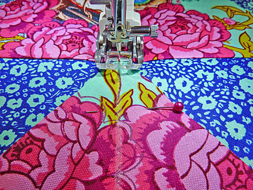 - Pin this row to your assembled center section (steps 1 and 2). Stitch in place, using a ¼” seam allowance.