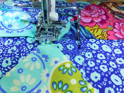- Re-thread the machine if necessary with thread to best coordinate overall with your patchwork in the top and bobbin. We used aqua. Lengthen the stitch.