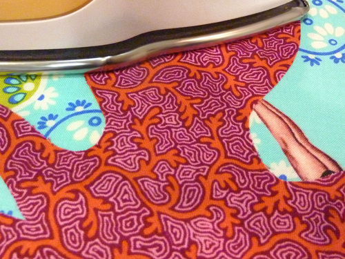 NOTE: Since you cut your strips on the bias, the piping should curve nicely around the three rounded corners of the triangle, but you can also cut a few slits into the flange of the piping to help it to bend around, however, be sure not to cut into your stitching. For more information, check out our tutorial: Sewing Smooth Curves Every Time. - To join, cut back the piping cord to butt together end to end.