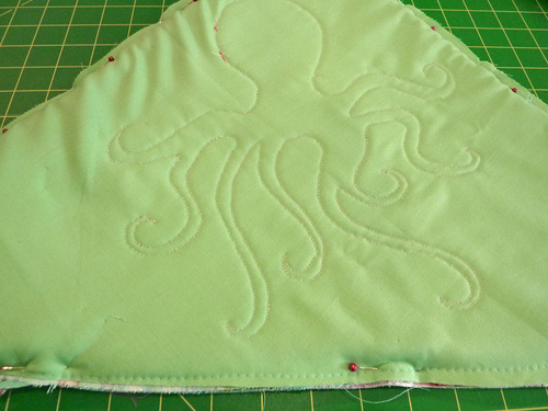 The back is where our handsome octopus lives. He’s just about a foot tall, which not only gives him a bold presence, but also allows the curves and points of his tentacles to be as large as possible for easier cutting and appliquéing.