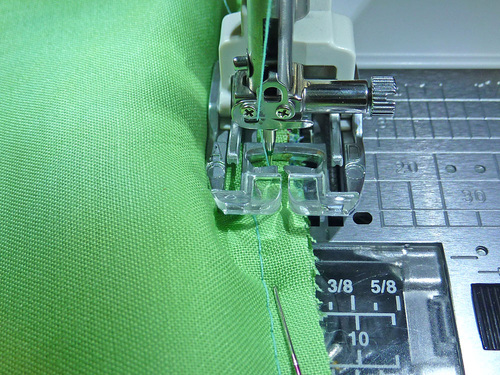 - First, machine baste all around, starting and stopping at either side of the opening. We suggest using Walking or Even Feed foot or engaging your machine’s built-in fabric feeding system, such as the Janome AcuFeed™ Flex system, which is what we used on our Janome Skyline S7.