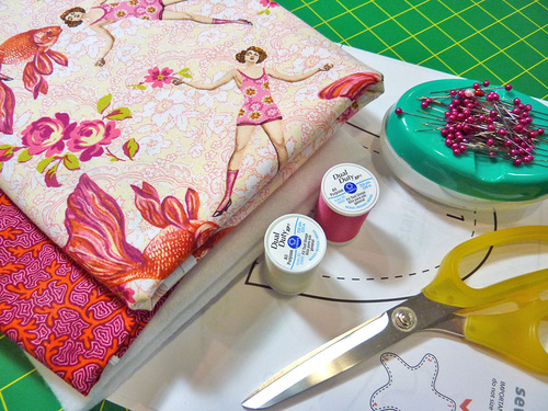 - ⅝ yard of 44″+ wide quilting weight cotton (fabric E in our design) for one side of the starfish pillow; we used What Would Poseidon Say? in Pink from TokyoMilk presents Neptune and the Mermaid by Margot Elena for FreeSpirit