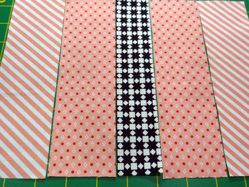 The cuts below show a full lining piece (8” x 8½”), which was our choice on the pink pouch. But you can also continue the patchworking theme on the lining and create the cut from two of more pieces. For our red pouch, we seamed together two 5” x 10” Jolly Bar pre-cuts and cut our finished lining panel from that.
