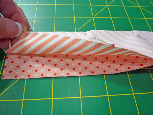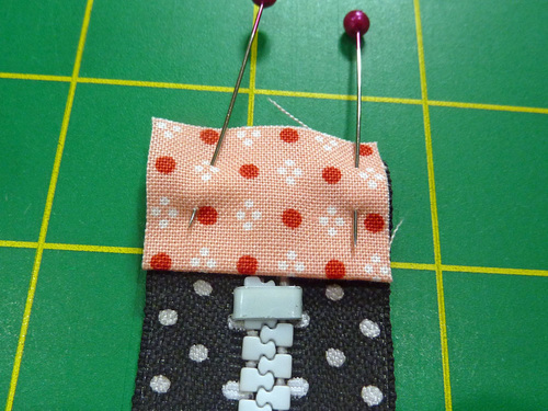 - Fold each piece in half, wrong sides together. Pin a folded tab to each end of the zipper, aligning the raw edges of the folded tab with the raw edge of the head and tail of the zipper tape just beyond the zipper stops.