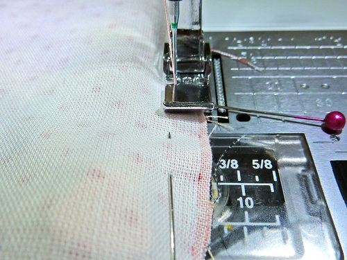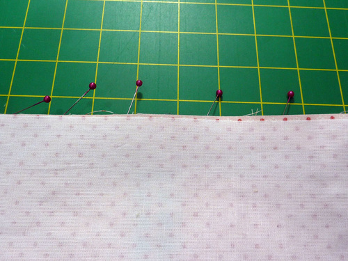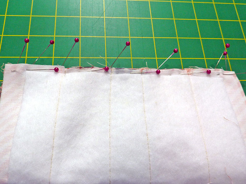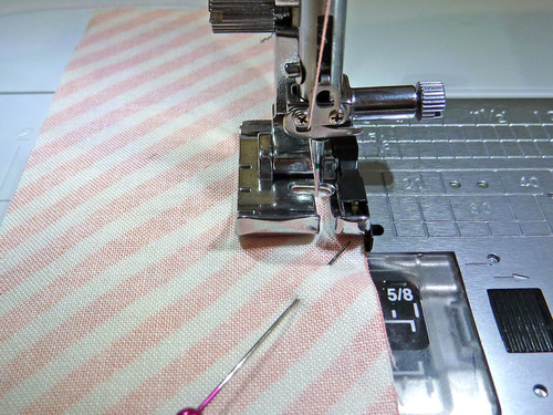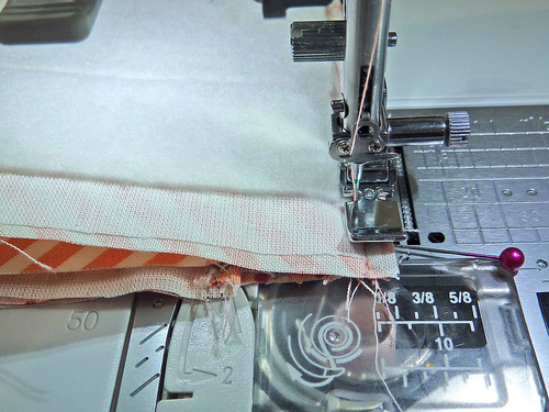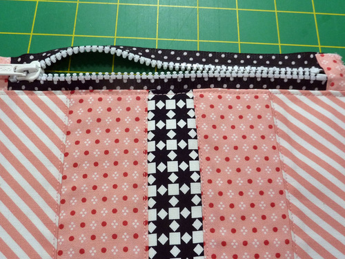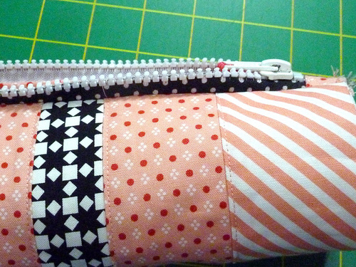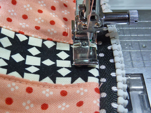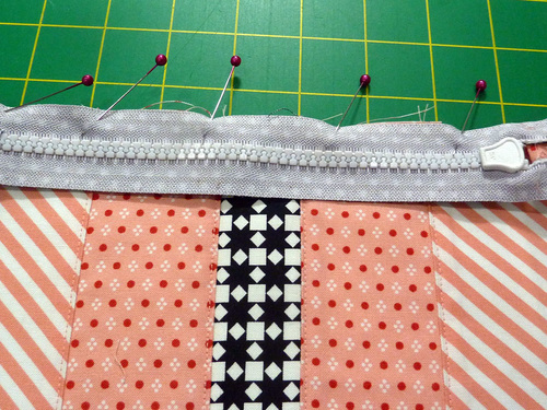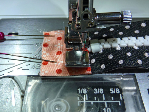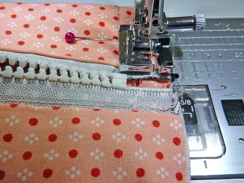 - Still using a Zipper foot, but with the stitch length re-set to normal, stitch across through all the layers. As above, you’ll need to move the zipper pull out of the way (and remove the pins) as you stitch across.
