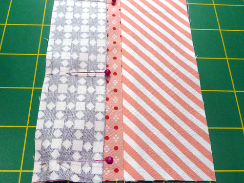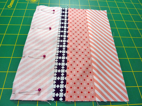 - Find the next piece in the sequence and pin it right sides together, along one inside edge, with the sewn pair.