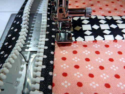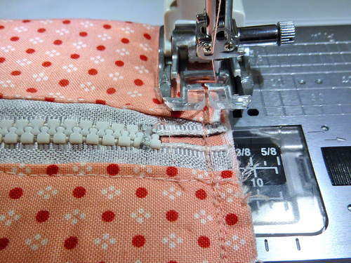 - Slightly lengthen the stitch. Edgestitch along the zipper teeth to hold the fabric layers together.