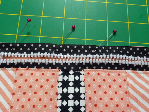 - Fold up the exterior panel, so it is now right sides together. Its raw edge should be flush with and in front of the remaining free edge of the zipper tape. Re-pin through all the layers.