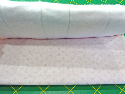 - Find the 7” x 7½” rectangle of fusible fleece. Center it on the wrong side of the exterior panel, which should already have its interfacing fused in place. There should be ½” of fabric extending beyond the fleece on all sides. Following manufacturer’s instructions, fuse in place.