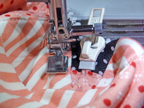 - The most futzing required will be at the beginning and end of the seam. You’ll need to twist the ends up a little to free them enough to start and complete the edgestitching. Go slowly!