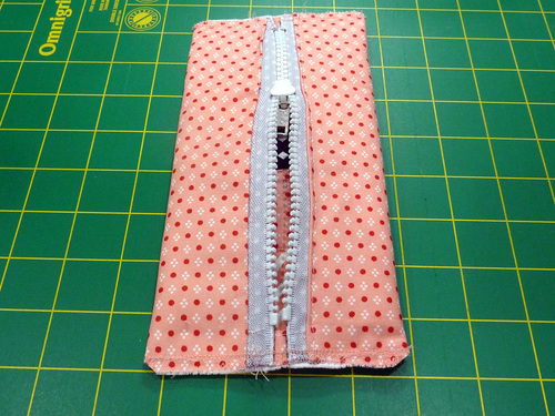 - Carefully turn the pouch wrong side out through the open zipper. Pin together each end.