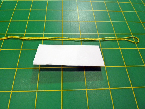 - Lay the tassel on top of another length of doubled floss.This length of floss should be perpendicular to the tassel and about ½” down from the top.