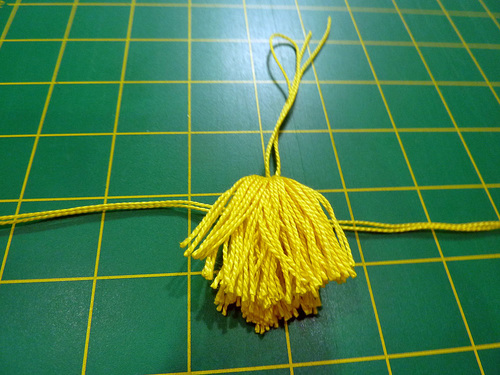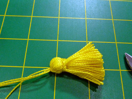 - Tie off the top with a length of doubled floss. Then cut away the bottom loops to free the tassel from the cardboard.