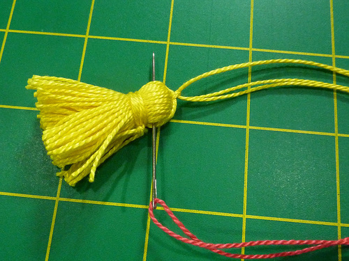 NOTE: If you are brand new to making your own tassels, we have a full step-by-step tassel tutorial you can review prior to starting the project. - When the two tassels are complete, thread a length of floss to match the top tassel (the pink tassel in our sample) through a large-eye hand sewing needle. Insert this length of floss through the head of the bottom tassel (the yellow tassel in our sample).